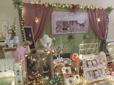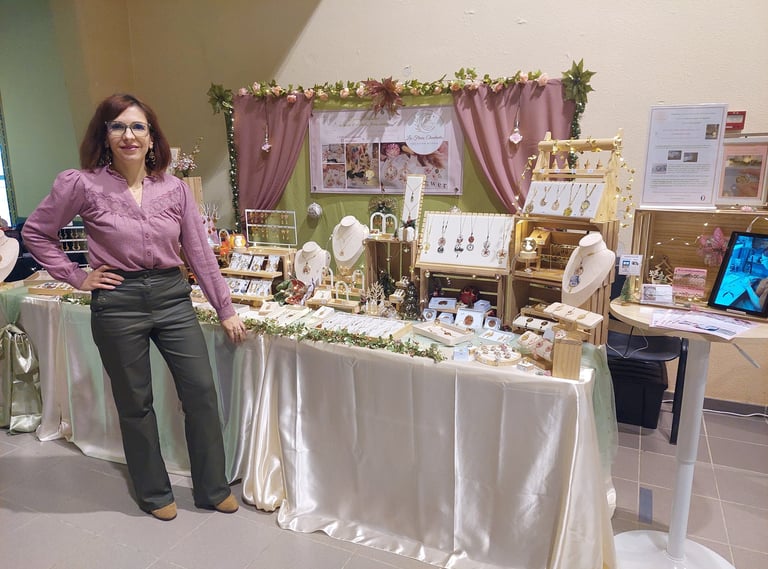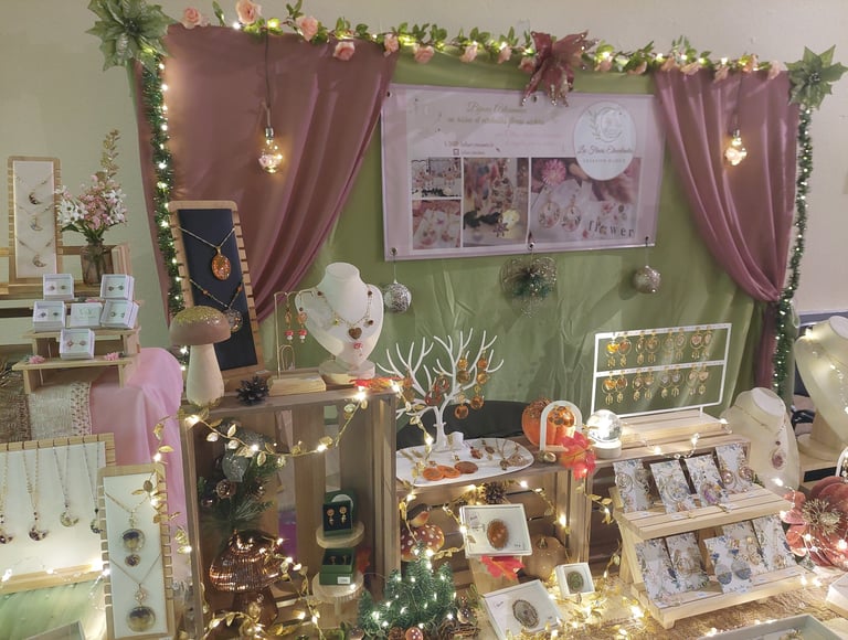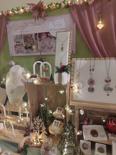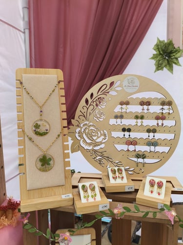 Création artisanale de bijoux avec des fleurs naturelles séchées préservées dans une résine époxy.
